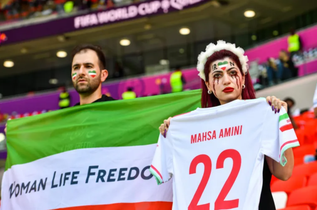 As the camera moved down the row of players, it captured stoic, cold, and silent faces staring blankly ahead. Not one member of the team sang the national anthem. In contrast to the muted players, the Iranian fans were loud and boisterous. However, many of these fans replaced the proud patriotic lyrics that praise the Islamic Republic of Iran with jeers, boos, and loud chants of “Zan, Zindagi, Azadi” (Women, Life, Freedom) and “Say her name, Mahsa Amini.”
